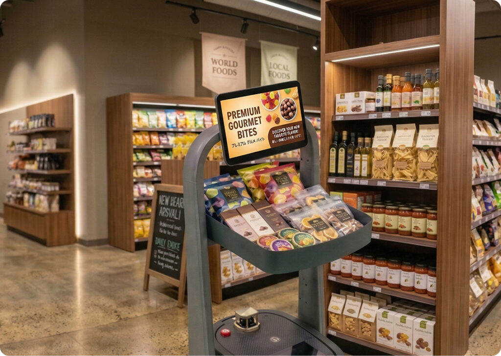 省人化する売場ラックとサイネージを搭載し、移動しながら商品や情報を訴求。人手不足の現場でも効率的な運用と売上向上をサポートします。